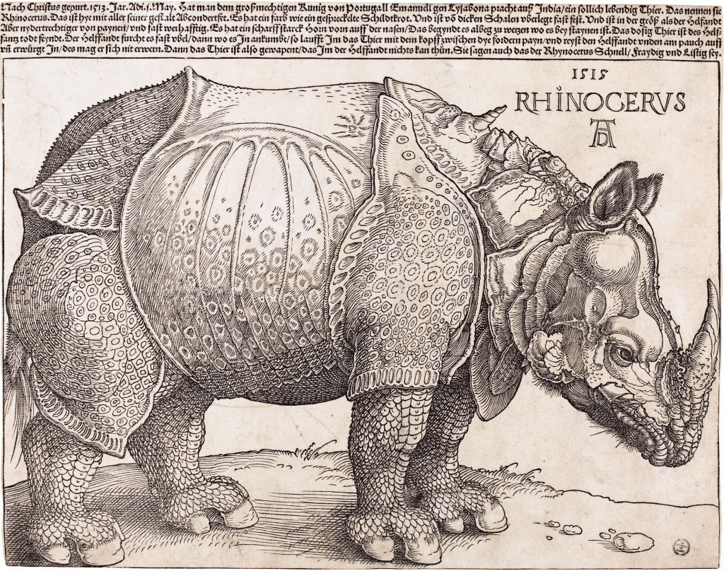 Albrecht Dürer, an artist, mathematician, engraver and painter living in Nuremberg read about this strange animal and based on the description, he began a pen sketch which became a woodcut. Dürer’s 1515 RHINOCERVS became famous. Dürer himself had never seen a rhino and hence his rendering was more fanciful than accurate.