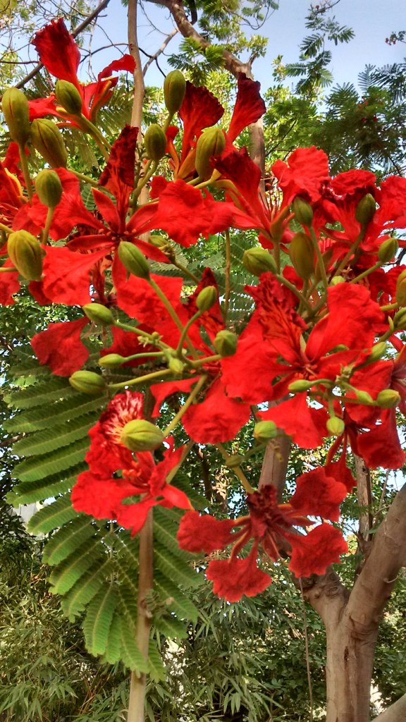 By whatever name we may choose to call it, this flamboyant tree is a great favourite for a wide variety of birds who use its abundant canopy for nesting, and who fill the air with an orchestra of calls with the break of dawn. They are joined by the silent activity of bats, squirrels and garden lizards who go about their business in the company of their feathered friends.