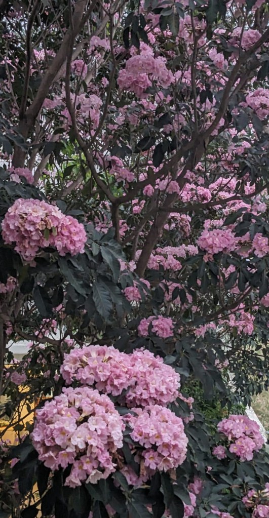 The first colours to touch the magnificent canvas were the exquisite pink-mauve hues of the Tabebuia rosea tree. This is the Rosy trumpet or Tecoma pink tree which is appropriately called Basant Rani (Queen of Spring) in Hindi. Almost overnight, the nearly leafless tree exploded into a profusion of pinkish- white trumpet-like flowers that literally wrapped the tree in a frothy cloud. Cities like Bangalore reveled in the sight of the avenues of these rosy ranis, while in my city we had to make do with a chance sighting of one of the few and scattered specimens of Tabebuia. I had the privilege of enjoying this beautiful sight of the single tree on my morning walk route. The glory was short-lived. Almost as quickly as it burst into blossom, the tree shed its flowers, overnight carpeting the area under the canopy with the delicate and faded flowers. One morning we were feasting on the full canopy, and the next morning there was nothing left on the tree but bare branches. The first delicate hues had been transferred to the canvas of summer.