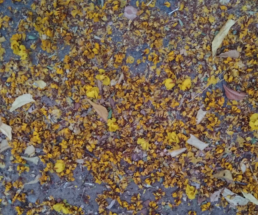 Even as the old flowers turn into pods, new flowers continue to bloom, as well as shed. The fallen flowers form a molten pool at its base. Unlike the laburnum, the flowers do not fade as they dry, and continue to attract attention even after they have left their lush green abode and travelled down to the earth.