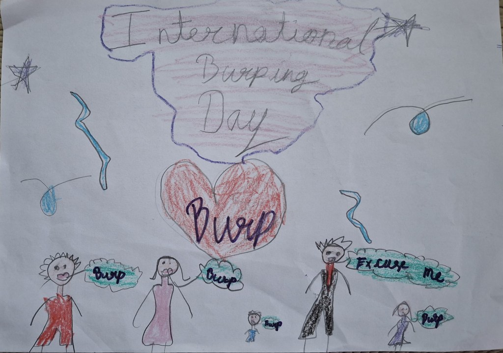 But the day that has fast become my favourite is the one suggested by my 7-year old grandchild. She has the gift of being able to burp at will, and a few weeks ago, she was exercising the gift incessantly. When told that it was very rude, she countered saying that it was ‘International Burping Day’, and that she was obligated to burp. She followed this up by making a poster for the day!